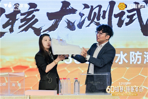 3月14日,深圳科技馆内,V6家居举办“6D蜂暴睡眠革命”系列新品发布会。围绕“用科技实现舒适生活”的品牌主张,现场通过极限飞车挑战、集装箱压顶、烟雾穿透、排水防潮四大测试,将6D蜂巢芯的支撑性、透气性、排湿性等技术指标转化为可感知的视觉呈现。在3.21世界睡眠日来临之际,这场硬核发布会让6D蜂巢芯的科技性能真正实现了可量化、可感知、可触及,也让V6家居“用科技实现舒适生活”的品牌主张,从一句口号变成了看得见的事实。